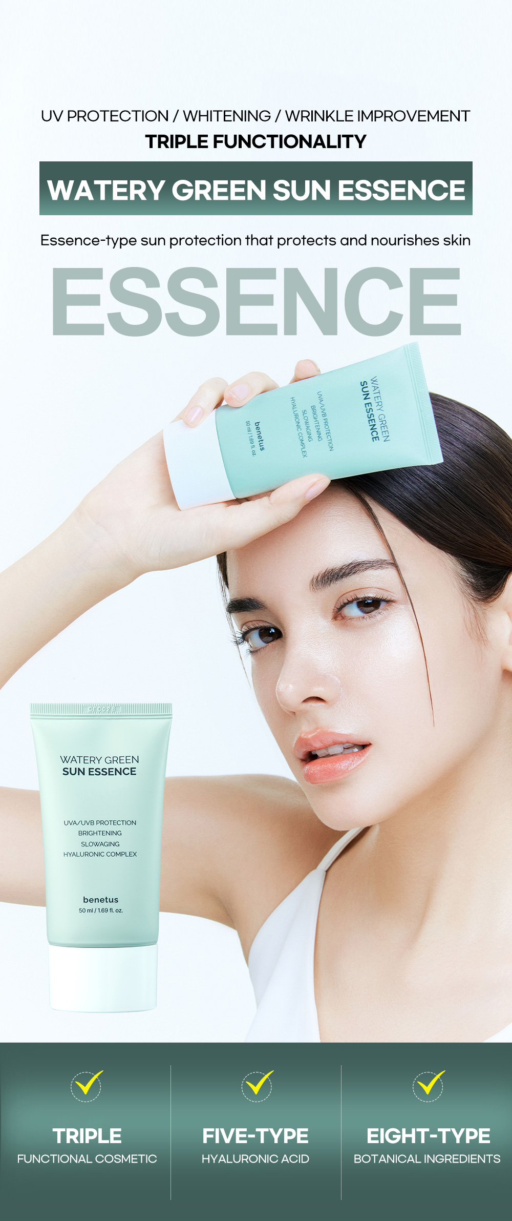 #TripleFunction #EssenceSunscreen #5LayerHyaluronicAcid #UVProtection #WrinkleCare #Whitening #Dual #Sunscreen